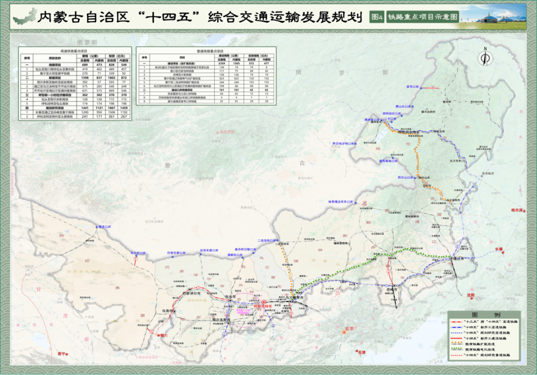 根據(jù)規(guī)劃里的綜合交通網(wǎng)絡建設項目表,內蒙古十四五期間將推進9條高鐵重點項目,總里程4030公里,總投資4855億元。其中:續(xù)建2條,新建3條,呼包鄂一小時經(jīng)濟圈2條,規(guī)劃研究2條。